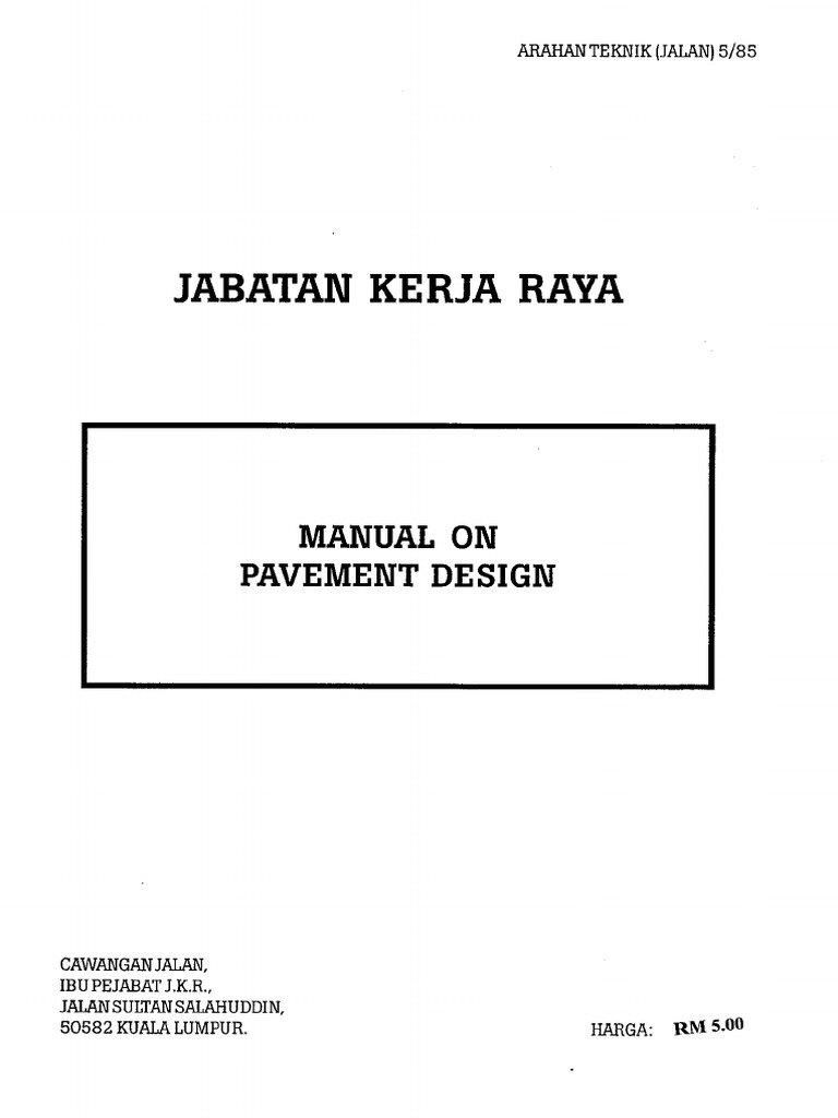 Page 1 arahan teknik(jalan) 5/85 cawangan jalan, ibu pejabat jkr, k.l jabatan kerja raya cawangan jalan ibu pejabat jkr malaysia jalan sultan salahuddin 50582 kuala lumpur for internal use only manual on pavement design. 3.3.6 the total traffic volume at the end of the design period should be checked as per 3.3.13 3.3.14 to ensure that the arahan teknik(jalan) 5/85. Adopt design method based on arahan teknik (jalan) 5/85 manual, manual on pavement design. Menurut arahan teknik (jalan) 8/86 bagi tujuan. (kira2 1/5 dari full load current).