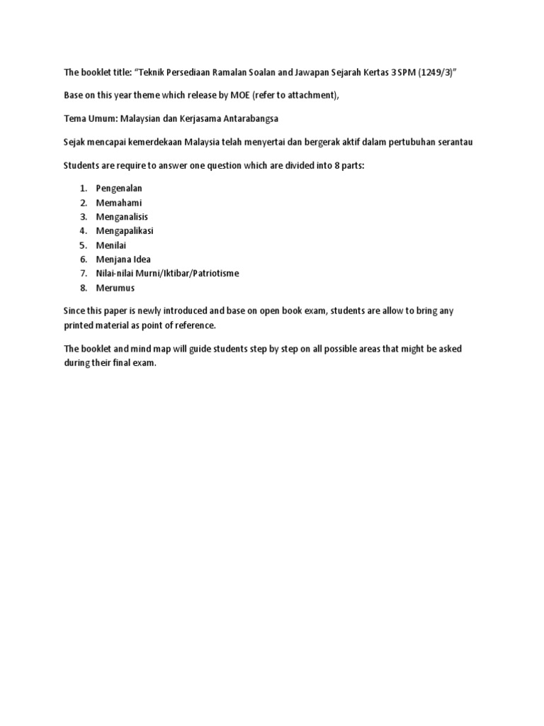 Tema umum sejarah kertas 3 yang dikeluarkan oleh lp ini adalah sebagai persediaan buat pelajar dalam menjawab soalan bagi tugasan spesifik dalam sejarah 1249/3 pada november yang akan hanya diumumkan pada hari peperiksaan spm nanti. Please fill this form, we will try to respond as soon as possible. Tema sejarah kertas 3 spm 2017. Tahun lepas, tema sejarah kertas 3 adalah berjudul kemunculan dan perkembangan nasionalisme sehingga perang dunia kedua. Spm sejarah kertas 3 all.
